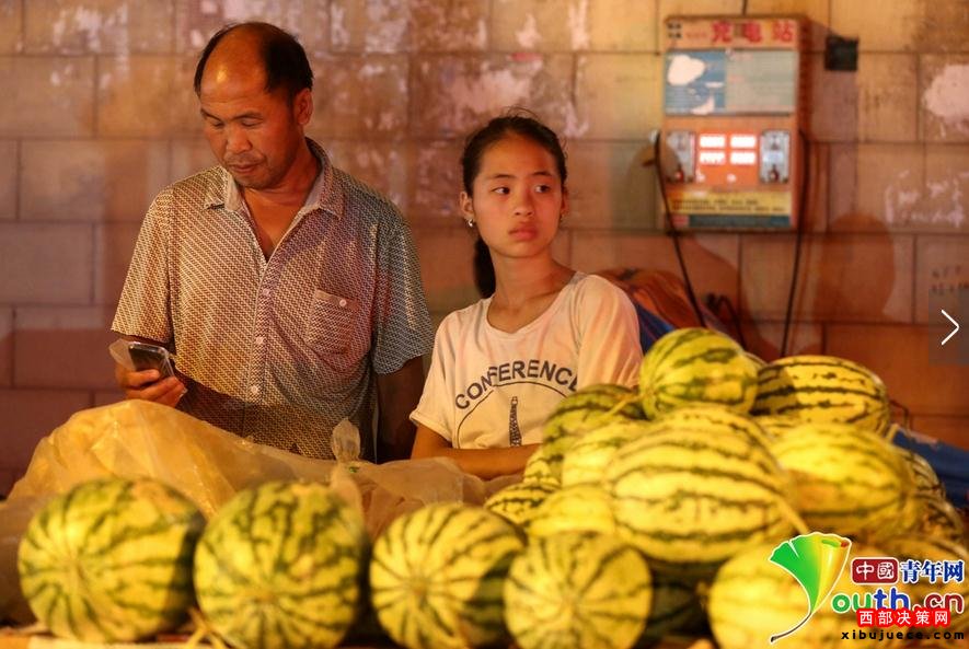 2016年7月10日夜晚,在河南省洛陽市老城街頭,宜陽縣高村鄉(xiāng)仟佰嶺村47歲的瓜農石勛帶著12歲的女兒賣西瓜。“現(xiàn)在帶女兒賣瓜讓她體驗一下瓜農的艱辛是為了長大女兒不再賣瓜,我家種了四畝西瓜,從家里到洛陽開拖拉機要跑六個小時,賣完西瓜回家趕,每天只能休息三個小時,女兒去最遠的地方就是洛陽城,一車西瓜賣完給女兒20塊零花錢,女兒很開心”。石勛說。