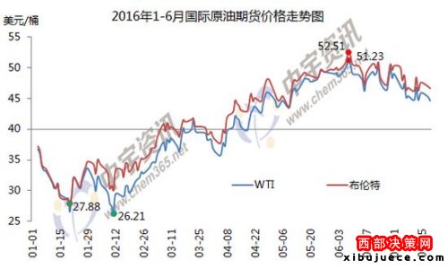 1-6月國(guó)際原油期貨價(jià)格走勢(shì)圖。來(lái)源:中宇資訊。