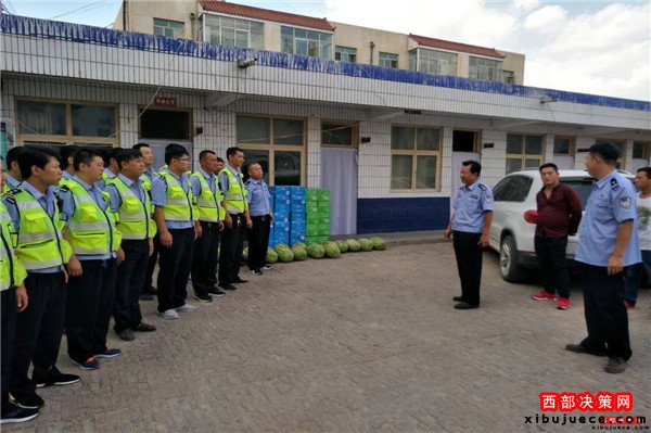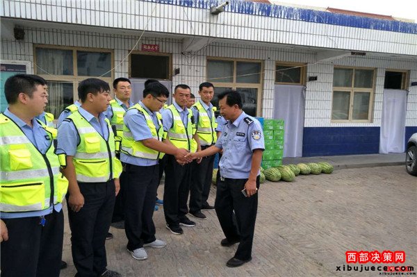 西部決策網(wǎng)訊( 鄒坤 通訊員 崔春月) 時值夏日,天氣持續(xù)高溫,2016年8月10日下午,靖邊縣公安局黨委委員、交警大隊(duì)長王世崗、辦公室主任黃瑞峰等一行來到該大隊(duì)城區(qū)二中隊(duì)慰問在高溫酷熱天氣下堅(jiān)守崗位的一線民警,深刻表達(dá)了大隊(duì)黨委對一線民警的關(guān)心和關(guān)愛,并將防暑降溫物品及時送到了一線民警手中。