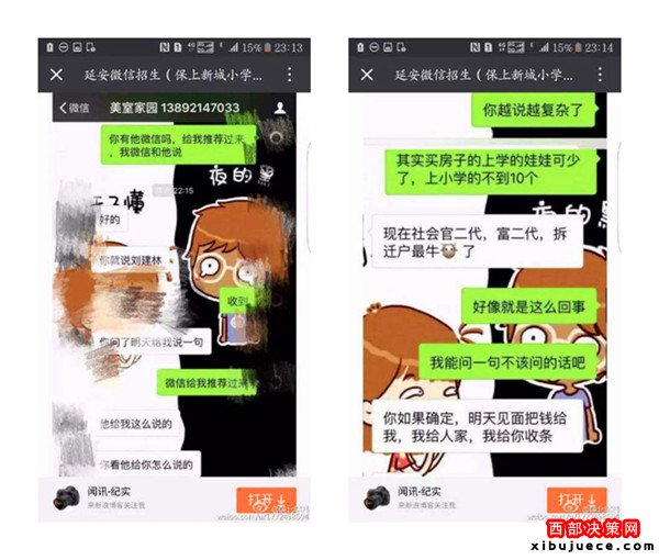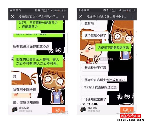 近日,一則題為《延安微信招生(3.2萬保上新城小學)請相關部門給予調查公布真相》的帖子在朋友圈瘋傳,內容是一位微信名叫“延安微信招生(保上新城小學)”的微友,聲稱只要花3.2萬元,保證可以在新區(qū)小學入學,并解釋有中間人,錢并不是直接給校長王紅霞,但愿意提供自己的車號、身份證號、家庭住址等信息作為擔保。3.2萬真的能夠保上延安新區(qū)小學嗎?事情真相究竟如何,記者展開調查。