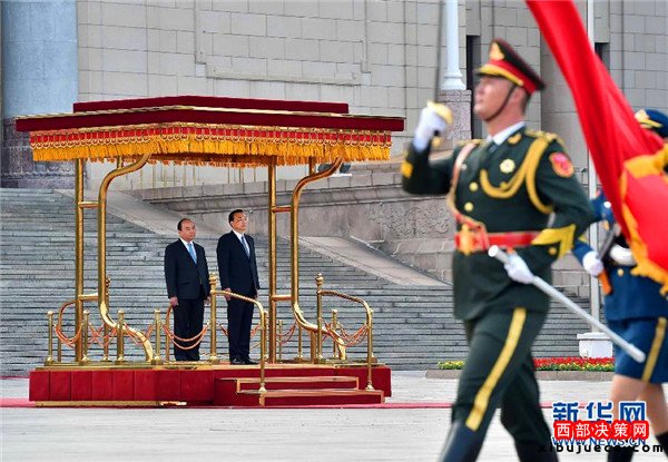 會談前,李克強(qiáng)在人民大會堂東門外廣場為阮春福舉行歡迎儀式。