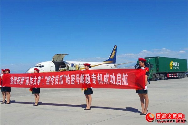 9月12日19:32分,一架裝載“密作”哈密古棗、“密作”哈密貢瓜的郵政專機從新疆哈密機場啟航首航廣東,將于13日凌晨抵達深圳機場。