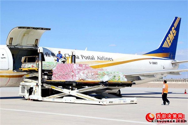 “密作”哈密古棗貢瓜正往郵政專機上裝運。