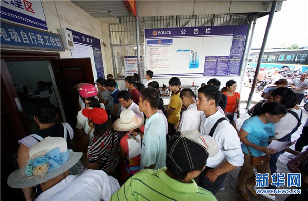 10月11日,市民在廣西南寧市獅山電動自行車工作站排隊給自己的電動自行車上牌。