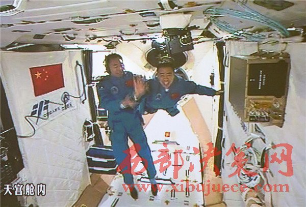 10月19日,神舟十一號(hào)航天員景海鵬和陳冬順利進(jìn)入天宮二號(hào)實(shí)驗(yàn)艙。景海鵬(左)和陳冬在天宮二號(hào)實(shí)驗(yàn)艙向全國(guó)人民問好并敬禮(攝于北京航天飛行控制中心大屏幕)。