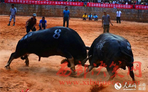 云南石林:60余頭斗牛爭(zhēng)奪"牛王"喜迎縣慶60周年