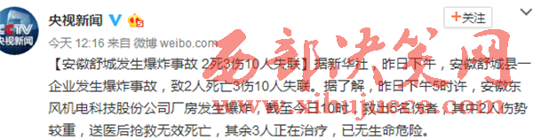 新聞中心官方微博今日消息稱,據(jù)新華社,昨日下午,安徽舒城縣一企業(yè)發(fā)生爆炸事故,致2人死亡3傷10人失聯(lián)。據(jù)了解,昨日下午5時(shí)許,安徽東風(fēng)機(jī)電科技股份公司廠房發(fā)生爆炸,截至今日10時(shí),救出5名傷者,其中2人傷勢較重,送醫(yī)后搶救無效死亡,其余3人正在治療,已無生命危險(xiǎn)。