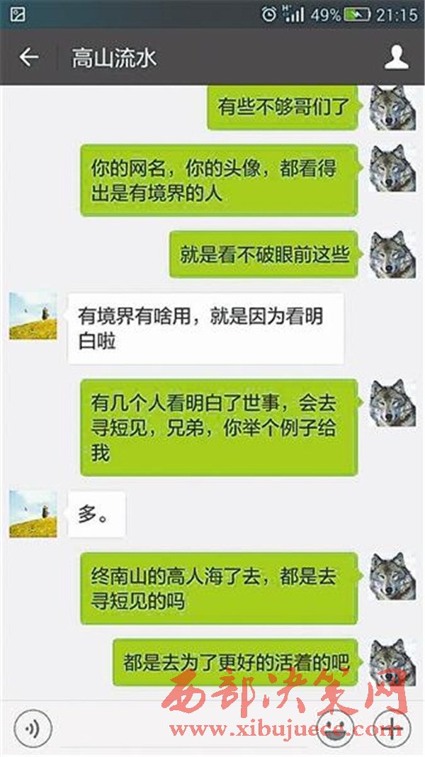 “跳樓算啦”、“堅(jiān)持不了了,死了也好”……11月12日晚,身在陜西的王先生怎么也睡不著,微信里23歲邛崍小伙徐超(化名),不斷表達(dá)著自己的“死意已決”。這讓他變得緊張而擔(dān)心,他不停地通過微信發(fā)去勸說信息,同時(shí)兩次向四川警方報(bào)警,希望小伙能夠放棄輕生的念頭。而其實(shí)兩人并不相識(shí),“只是通過一個(gè)帖子偶然結(jié)識(shí)的,甚至不知道他的名字。”王先生說。