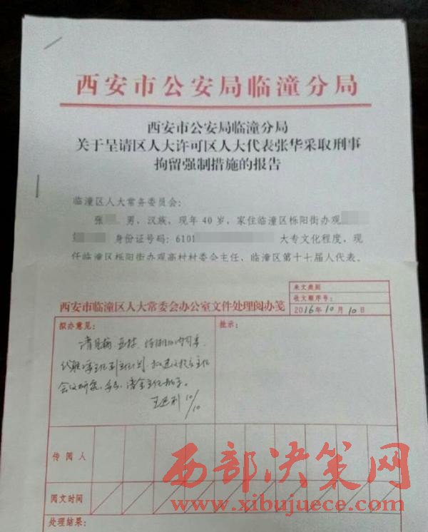 相關(guān)人士向澎湃新聞提供的一份西安市公安局臨潼分局關(guān)于“呈請區(qū)人大許可區(qū)人大代表張華采取刑事拘留強(qiáng)制措施”的報(bào)告顯示,張華,男,家住臨潼區(qū)櫟陽街辦觀高村第六組,現(xiàn)任臨潼區(qū)櫟陽街辦觀高村村委會主任,臨潼區(qū)第十七屆人大代表。上面還附有西安臨潼區(qū)人大常委會辦公室文件處理閱辦箋的擬辦意見:“需研究決定”。