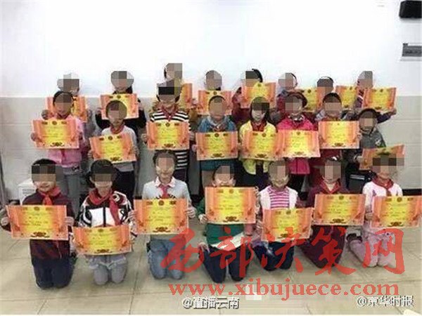 近日,網(wǎng)友“直播云南”發(fā)布微博稱,昆明市盤龍區(qū)東莊小學在校內(nèi)舉辦了《滇池清昆明興》手抄報活動。在學校公布的獲獎合照中,有學生手持獎狀,跪在地上。從微博配圖中可以看到,共有23名學生獲獎。16名學生站在后面,另7名學生面帶笑容,手里舉著獎狀,跪在前排。
