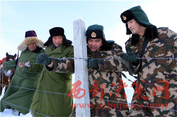 庫爾特邊防派出所官兵與護邊員修補損壞的鐵絲網(wǎng)。