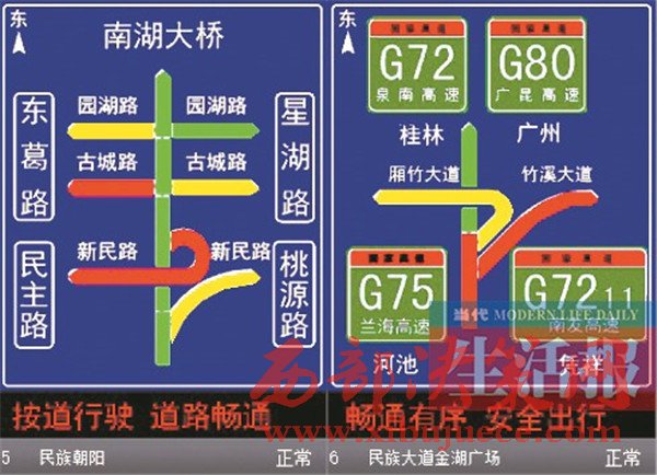 “至埌東客運(yùn)站旅行時間5分鐘”的提示,同時顯示周邊多條道路都是綠色……駕車在民族大道上會看到類似這樣的提示,這是南寧交警部門與高德地圖合作的成果。目前,高德地圖提供的實時路況交通信息已經(jīng)陸續(xù)上線南寧市交通誘導(dǎo)屏。在民族大道沿線的60塊誘導(dǎo)屏,均可以清楚地反映實時路況信息和道路擁堵狀況。