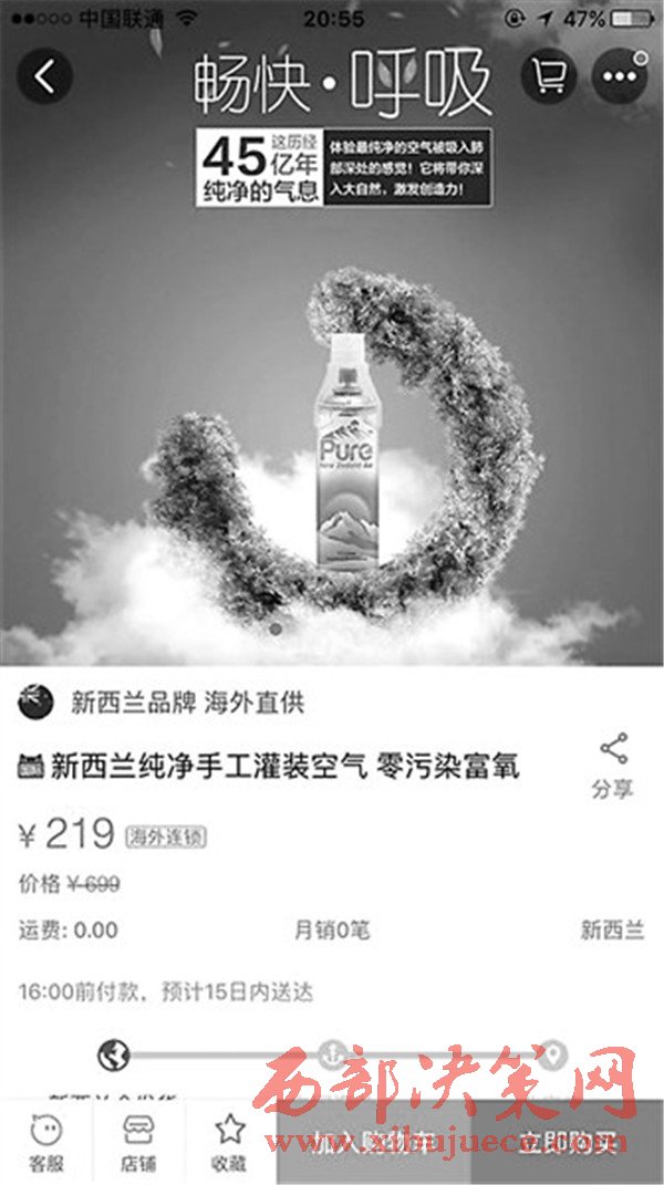 “想呼吸到最純凈、最新鮮的空氣嗎?那就來瓶威海最純凈新鮮的空氣吧!無霧霾,絕對(duì)純凈!可海邊,可山區(qū),不加價(jià)!”在某電商平臺(tái)上,一家名為“威海自駕游俱樂部”的網(wǎng)店,掛出了名為“威海天然新鮮空氣”的商品,并打出了如上的廣告語。
