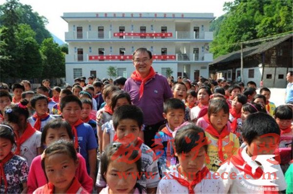 (2013年,葉其超到遵義市務(wù)川縣涪洋鎮(zhèn)雙河小學(xué)看望學(xué)生,他們身后的新樓是葉其超捐款50萬元援建的希望食堂、宿舍。)