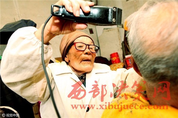 圖為,河南許昌,80歲的蔡瑞云為顧客理發(fā)。