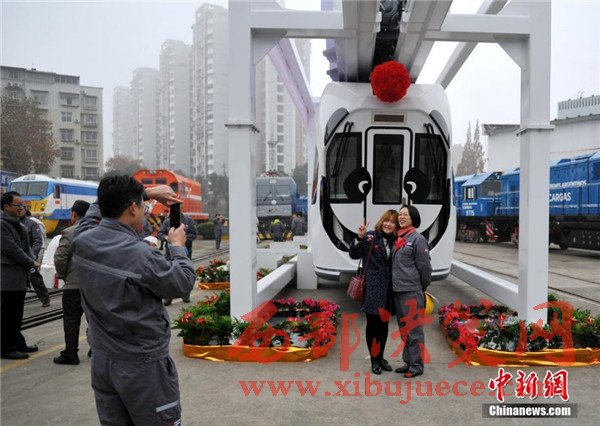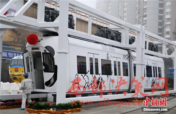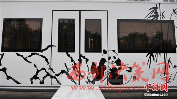 記者在現(xiàn)場看到,正式下線的空鐵車身為卡通熊貓山水圖案,酷似“熊貓”,每列定員144人,時速最高可達65公里。列車采用“大容量動力蓄電池充放電控制技術(shù)”,通過實現(xiàn)高倍率放電,提高列車起動加速性能及對極限環(huán)境的適應(yīng)性,同時能將400千瓦的電制動功率全部用于動力電池快速充電,實現(xiàn)制動能量回收再利用,延長蓄電池續(xù)航里程達120千米。圖為車身外繪制有熊貓山水圖案。
