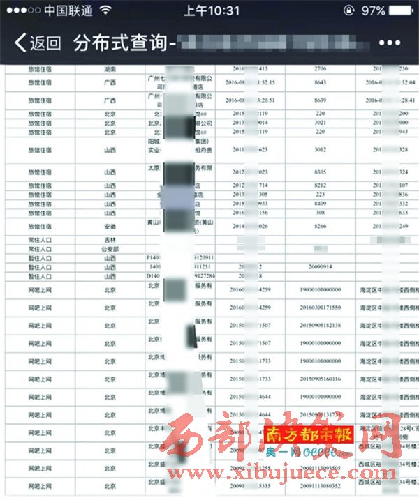 12月8日,南都記者以了解親戚結(jié)婚對象為由,聯(lián)系上一家名叫“××商貿(mào)”的服務(wù)商,工作人員介紹,只需提供身份證號碼,即可查詢包括開房記錄、列車記錄、航班記錄、網(wǎng)吧記錄、出境記錄、入境記錄、犯罪記錄、住房記錄、租房記錄、銀行記錄、駕駛證記錄等11個項目在內(nèi)的材料,統(tǒng)稱“身份證大軌跡”。