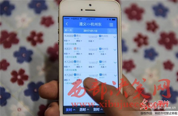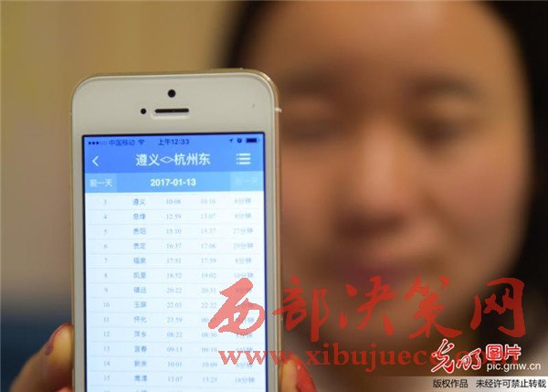 2016年12月15日,一名貴州省余慶縣市民通過手機(jī)客戶端購(gòu)買春運(yùn)首日的車票。