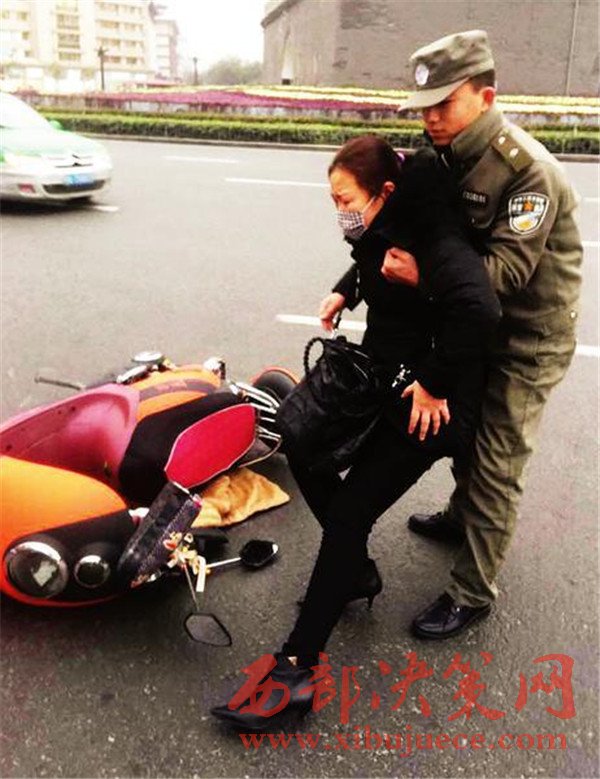 昨天下午,碑林區(qū)城市管理綜合行政執(zhí)法柏樹(shù)林中隊(duì)兩名執(zhí)法隊(duì)員在鐘樓開(kāi)元商城區(qū)域正常開(kāi)展巡查時(shí),一女子騎著電動(dòng)車(chē)被一輛轎車(chē)撞倒,執(zhí)法人員迅速?zèng)_上前將其扶到路邊,并報(bào)警。