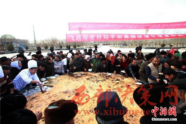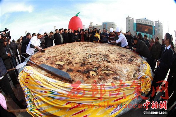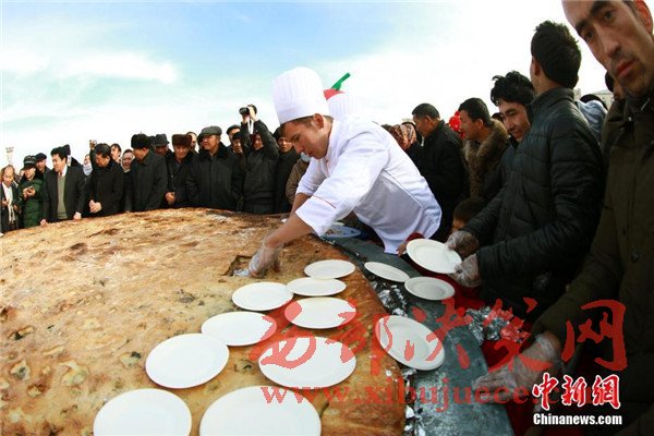據(jù)悉,庫(kù)麥其是維吾爾族傳統(tǒng)美食,又稱且末“大披薩”,用300公斤面粉、200公斤羊肉、60公斤洋蔥,花費(fèi)4個(gè)半小時(shí)制成,直徑達(dá)3.65米,寓意一年365天,天天有肉馕吃。圖為廚師忙著為游客切“最大的庫(kù)麥其”。