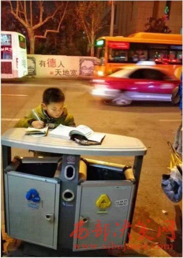 原標題:寒夜中 這個8歲男孩趴在垃圾桶上寫作業(yè)