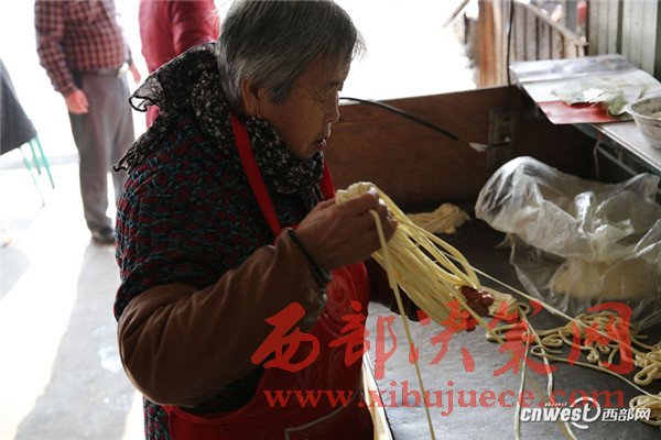 食客來了就可以將粗條面拉細,拉細后像繞線一樣繞在手上,再在案板上摔打幾下讓面條變細變得更勻稱,就可以下鍋煮面了。和面要用溫水,只放一點點鹽,其它啥都不加。