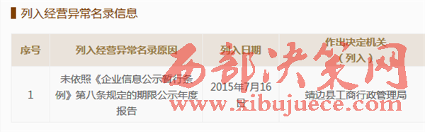 靖邊興發(fā)公司2015年7月16被工商部門列入經(jīng)營(yíng)異常名錄