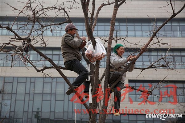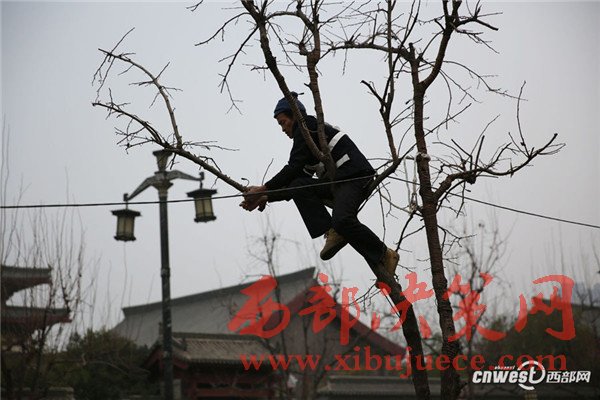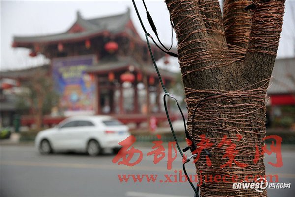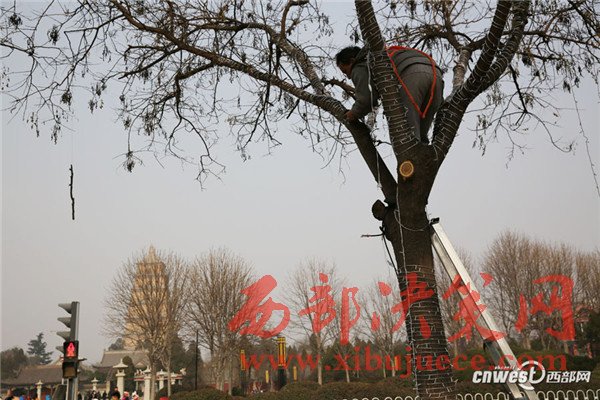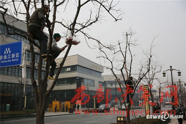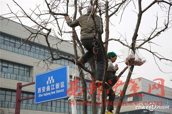 12月24日,西安市曲江新區(qū)芙蓉南路、雁塔南路,不少工人爬到樹上綁彩燈。一名正在樹上往樹枝上一圈一圈纏繞彩燈的師傅說:“綁一棵樹的彩燈一人得花半天到一天時(shí)間。”