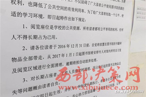 記者看到就在圖書館的入口貼著圖書館關(guān)于清理閱覽室座位的通知,上門寫著因?yàn)轲^內(nèi)占座問題屢禁不止,請同學(xué)們在12月31號前將自己的物品帶走,從1月1號起將全面清理閱覽室,通知貼出的時(shí)間是12月28號。