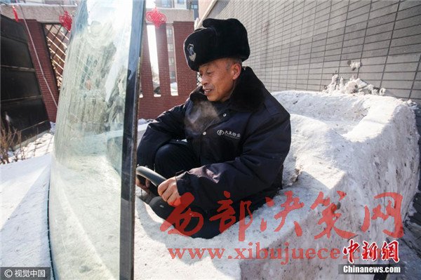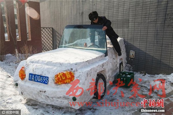 1月3日,吉林省長春市,六旬保安組團(tuán)建雪雕汽車,上車下車用啤酒箱當(dāng)踏板。