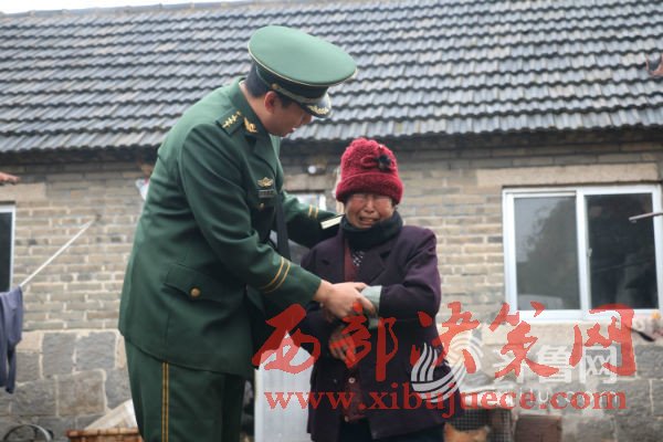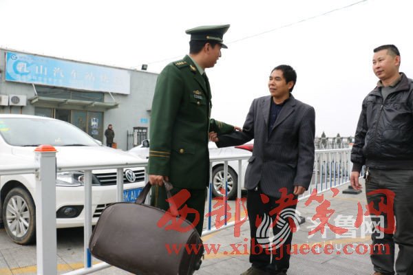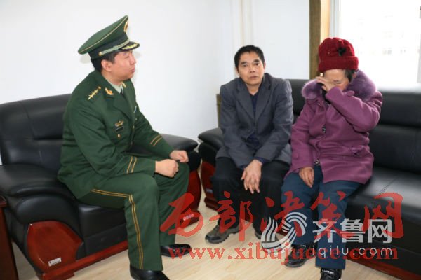 1月9日,周開(kāi)樹(shù)在南黃邊防派出所為母親開(kāi)具無(wú)戶籍證明后,然后帶母親來(lái)到青島,當(dāng)天下午坐上了青島至成都的火車,坐在火車上,周開(kāi)樹(shù)的眼前又浮現(xiàn)出當(dāng)年的情景,一個(gè)11歲的少年,緊緊拉著母親的手:“媽媽,您別走,長(zhǎng)大后我養(yǎng)活您……”圖為周開(kāi)樹(shù)與南黃邊防派出所民警見(jiàn)面。