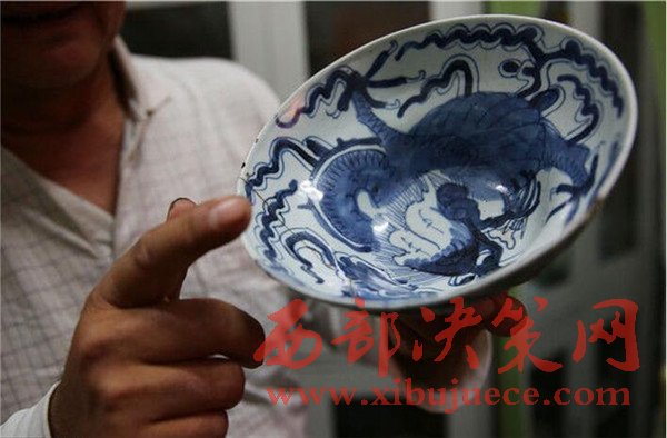 2016年9月23日,陜西榆林,清乾隆青花瓷過橋龍圖案從碗外延伸到碗內(nèi)。