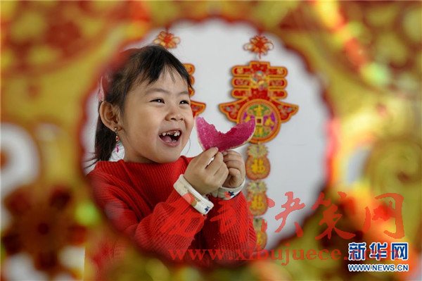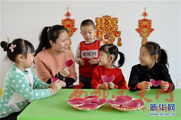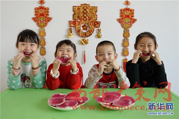 2月3日,河北省邢臺(tái)市橋東區(qū)三義廟社區(qū)的兒童在社區(qū)兒童娛樂室吃蘿卜“咬春”。