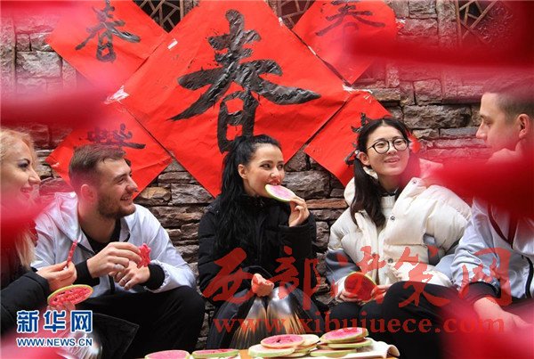 2月3日,在山東省臨沂市沂南縣竹泉村,來自俄羅斯的游客瑪麗婭(中)與同伴在開辦農(nóng)家樂的村民肖蕊(右二)家中吃生蘿卜,體驗(yàn)“咬春”。