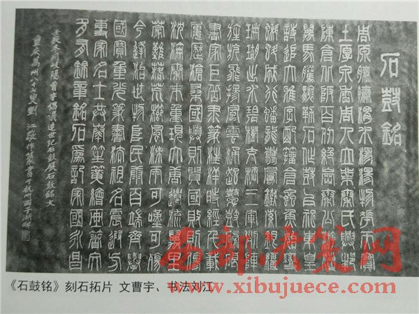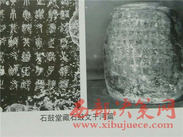 曹老早在40多年前就潛心鉆研石鼓。唐627年,陜西寶雞岐山北坡的荒郊首次發(fā)現(xiàn)石鼓。此地曾是秦朝舊地。共十枚,髙約2尺,徑約3尺,分別刻有大篆四言詩一首,共十首,計718字。定名:車工、千沔、田車、鑾車、霝雨、乍原、吳人、而師、馬薦、吾水。內(nèi)容最早被認為是記敘周宣王出獵的場面,后有專家論證為秦時記敘游獵的遺物,故稱“獵碣”。