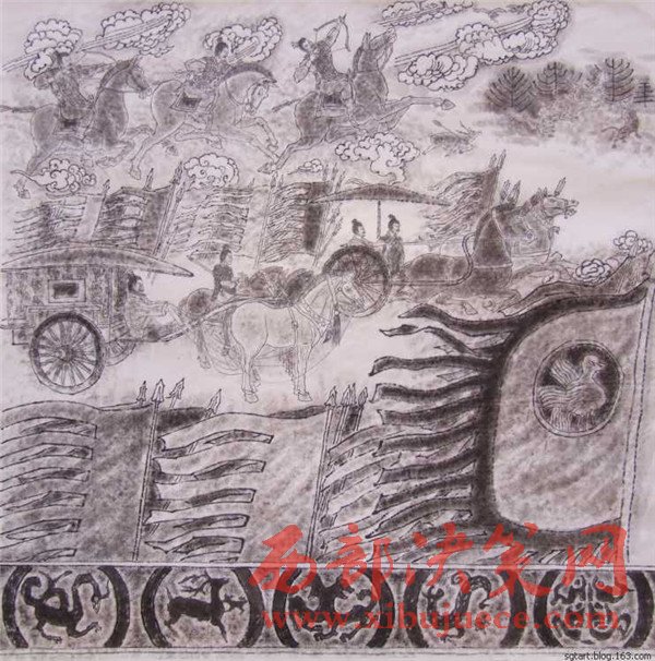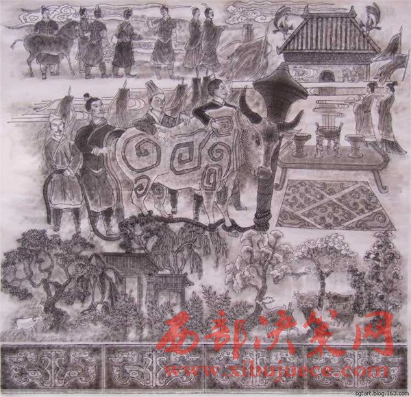 曹老經(jīng)過深思熟慮后1989年作出第一幅石鼓畫像,但他并不滿意。石鼓文的博大精深、源遠流長豈能是他輕易能描繪得出來的!他覺得自己還沒有吃準石鼓文的深邃含義。他明白:淺薄自滿是藝術的致命傷,能對自己自省和不滿的人,才會創(chuàng)作出能經(jīng)得起時間和歷史檢驗的藝術佳作。曹老痛下心撕了又畫,兩易其稿后,心里還不踏實,他必須尋找“最為挑剔的眼睛”。于是,他帶著十幅畫作,趕赴京城,讓石鼓專家鑒定審核。果不其然,專家們給他指出了一些問題:畫的時間不對,人物衣著不符合朝代特征。曹老虛心聽取了專家的意見,他返回寶雞,廢棄了原稿,重新考證人物的歷史特征,生活細節(jié)的一點一滴。他為了能精確地描繪先秦時期的人物和服飾,甚至每一件物件、器皿、圖案,他借來了秦兵馬俑博物館的圖像和資料,依據(jù)兵馬俑中人物的衣著打扮,紋飾車馬,2000年之后,第三次拿起筆重新準確地描繪出了十面石鼓中的眾多人物、眾多民俗風情。為了讓《石鼓文圖》經(jīng)受更嚴格的“審批”,曹老并沒有急于發(fā)表,而是連續(xù)奔波了幾年,直到2007年終于定稿與世人見面。