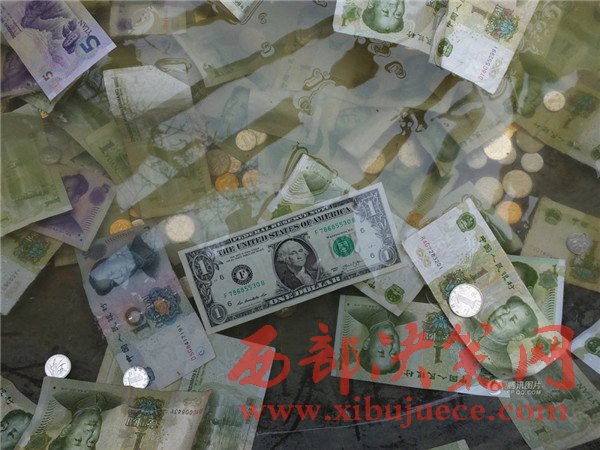 銅缸里不僅有很多面額1元、5元、10元、20元的人民幣,還有1元面額的美金。
