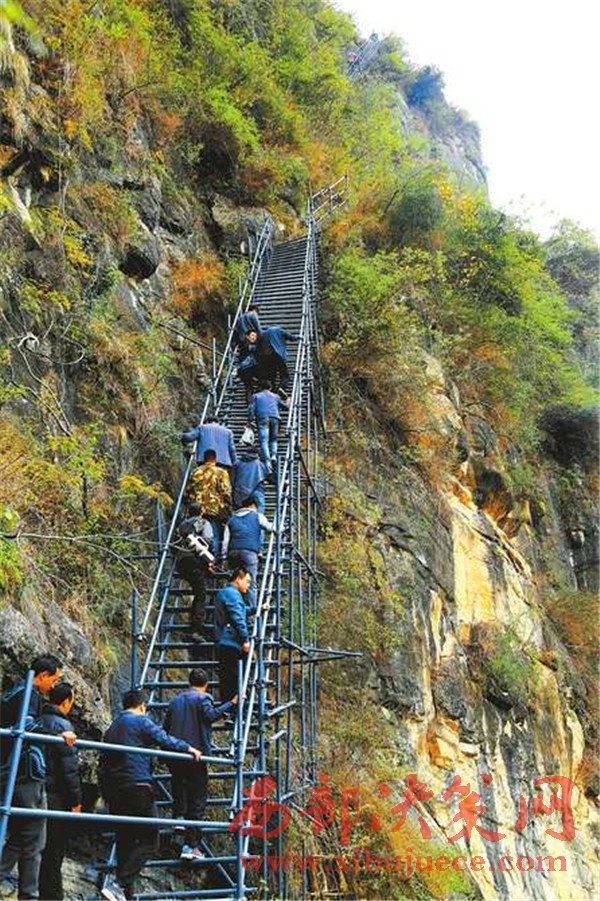 鋼梯,是從去年8月開(kāi)始啟動(dòng)修建的,州、縣兩級(jí)財(cái)政共投入了100萬(wàn)元。11月,鋼梯完工投入使用。莫色子古說(shuō),這些鋼管牢牢焊入懸崖,一共組成21段、767級(jí)臺(tái)階。整個(gè)鋼梯用了大約1500根、40多噸鋼管,光是固定用的扣件,就用了6000多個(gè)。