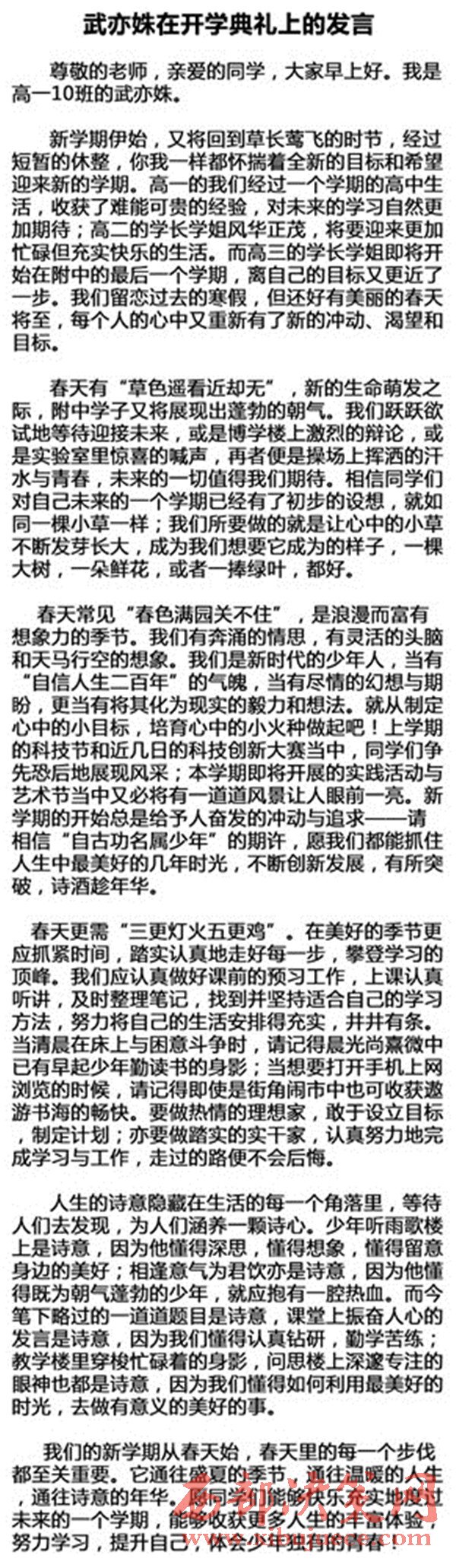 據(jù)復(fù)旦附中官網(wǎng),中小學(xué)紛紛舉行開學(xué)典禮。16日上午,復(fù)旦大學(xué)附屬中學(xué)2016學(xué)年第二學(xué)期開學(xué)典禮隆重舉行。榮獲中央電視臺(tái)第二季中國(guó)詩詞大會(huì)全國(guó)總冠軍的文理學(xué)院學(xué)生武亦姝上臺(tái)發(fā)言。