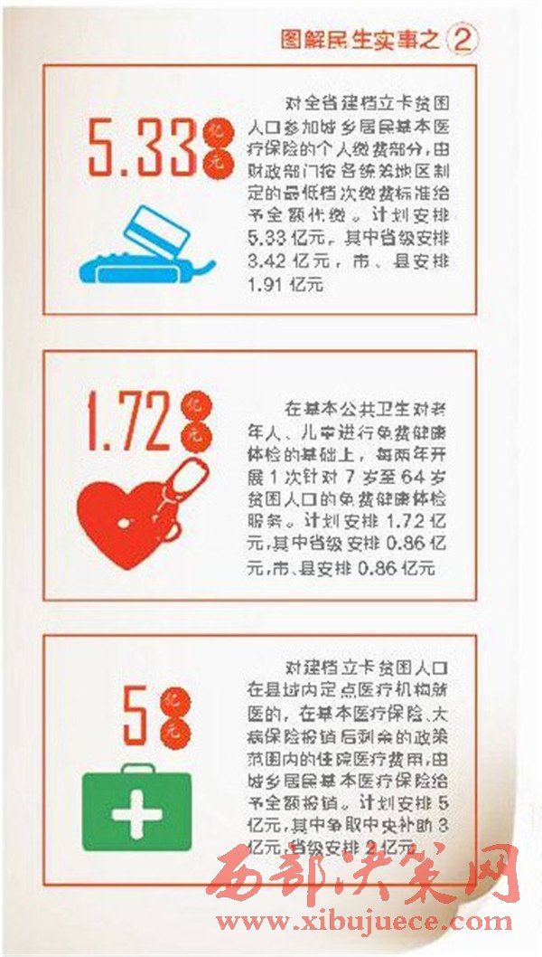 對(duì)建檔立卡貧困人口在縣域內(nèi)定點(diǎn)醫(yī)療機(jī)構(gòu)就醫(yī)的,在基本醫(yī)療保險(xiǎn)、大病保險(xiǎn)報(bào)銷后剩余的政策范圍內(nèi)的住院醫(yī)療費(fèi)用,由城鄉(xiāng)居民基本醫(yī)療保險(xiǎn)給予全額報(bào)銷。計(jì)劃安排5億元,其中爭(zhēng)取中央補(bǔ)助3億元,省級(jí)安排2億元