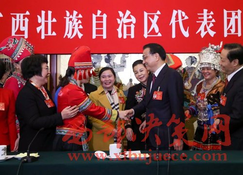 【李克強(qiáng)在廣西團(tuán)巧借“劉三姐”祝福全國(guó)女同胞】三八婦女節(jié)這天,李克強(qiáng)來到廣西代表團(tuán)參加審議報(bào)告。他首先祝在場(chǎng)的女代表及女同胞節(jié)日快樂??偫碚f:“廣西是劉三姐的家鄉(xiāng),她的歌聲至今余音繚繞,代表了女同胞美好的形象。我在這里向你們,并通過你們向全國(guó)女同胞致以節(jié)日的問候和衷心的祝福。”