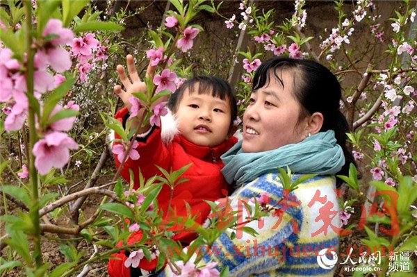 在新疆生產(chǎn)建設兵團第五師八十六團一溫室大棚里,桃花盛開,春意盎然,一游客帶著孩子正在觀賞桃花。目前,桃花迎來了盛花期,吸引了周邊游客前來賞花、拍照,感受春天的氣息。