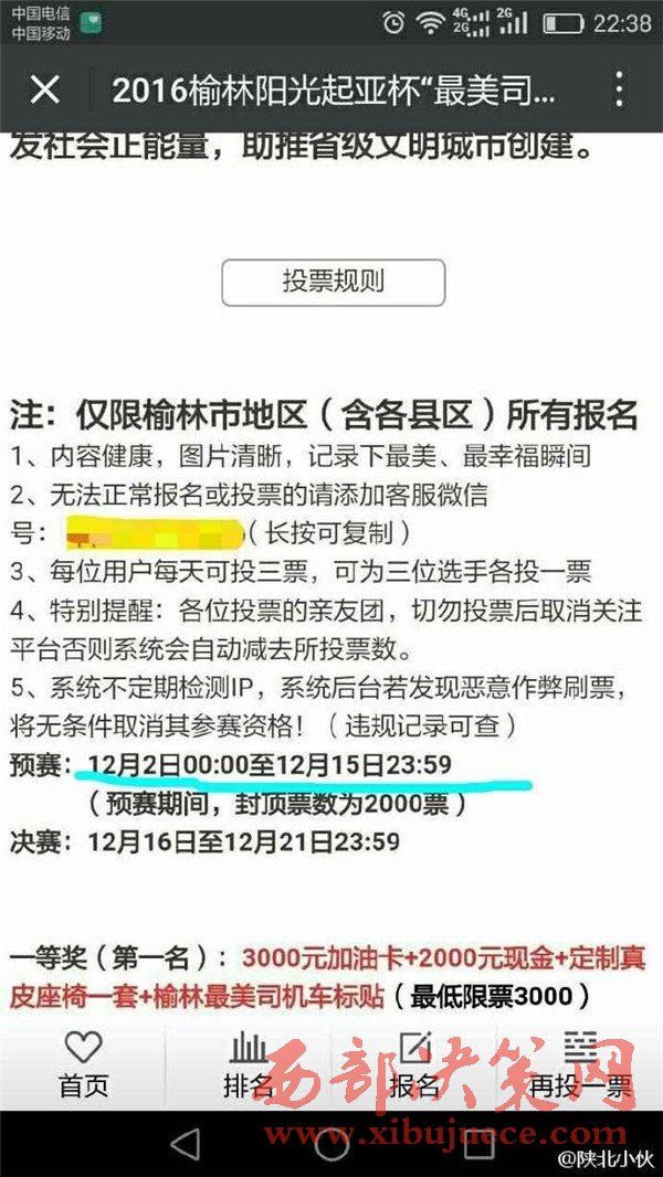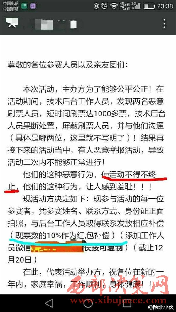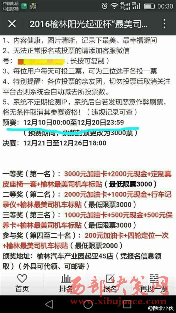 2016年12月初,榆林陽光汽貿(mào)通過某公眾號發(fā)起2016榆林陽光起亞杯“最美司機”評選活動,活動設(shè)置了豐厚了獎品作為獎勵。并組織全民參與評選活動的投票行為。至此,在榆林眾多市民的朋友圈都發(fā)起了轉(zhuǎn)發(fā)拉票行為。然而,此次拉票行為卻不斷變更投票時間和決賽時間。近日,某公眾號發(fā)布信息,聲稱陽光汽貿(mào)組織的“最美司機”活動取消,并給予相應(yīng)的票數(shù)補償。此行為卻引起眾多市民的質(zhì)疑,認(rèn)為陽光汽貿(mào)是在“消遣”參與投票的近萬名市民,從而變相成廣告推銷行為。究竟陽光汽貿(mào)是心疼評選活動的獎品發(fā)放,還是一種涉嫌商業(yè)的欺詐行為,請@榆林工商 ,根據(jù)《消費者權(quán)益保護法》予以重查重處。