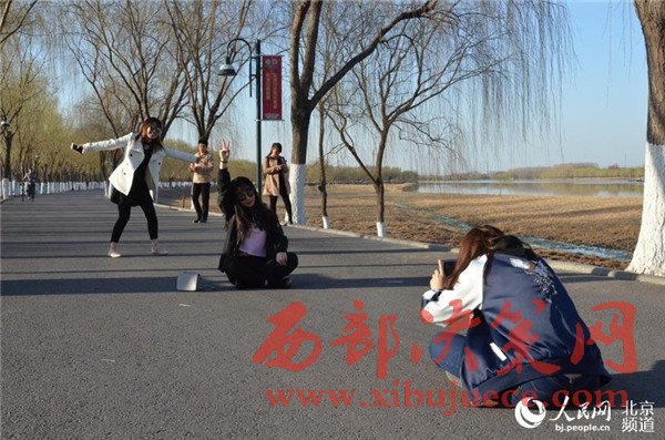 游人在大運河森林公園的春光中拍照。