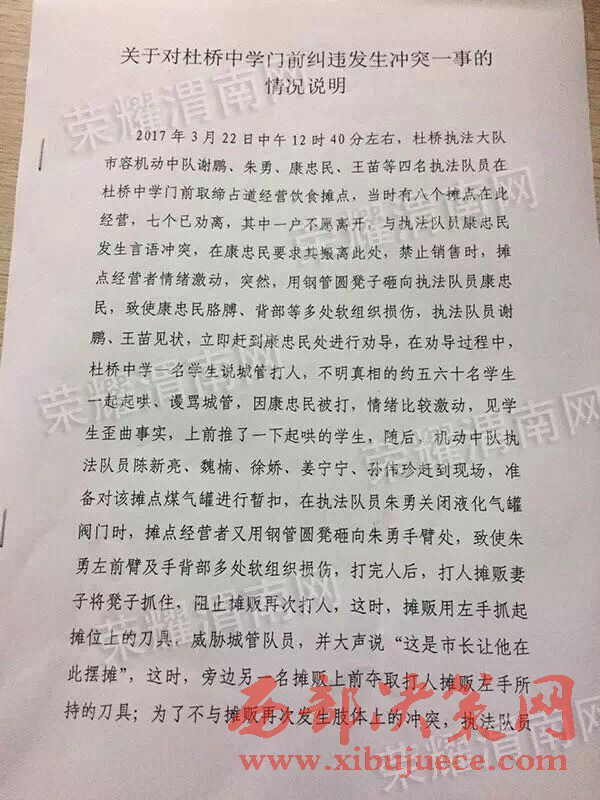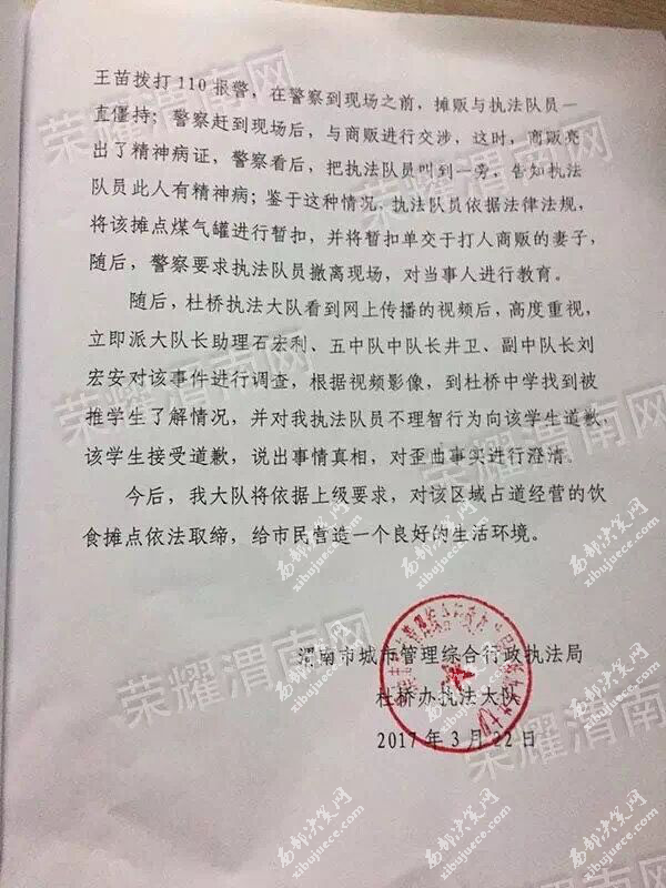 當(dāng)晚6點(diǎn)以后,涉事執(zhí)法隊(duì)員所屬執(zhí)法大隊(duì)杜橋執(zhí)法大隊(duì)書面回復(fù)便在網(wǎng)絡(luò)中被網(wǎng)友們不斷的轉(zhuǎn)載。據(jù)該回復(fù)稱:2017年3月22日中午12時(shí)40分左右,杜橋執(zhí)法大隊(duì)市容機(jī)動(dòng)中隊(duì)謝鵬、朱勇、康忠民、王苗等4名執(zhí)法隊(duì)員在杜橋中學(xué)門前取締占道經(jīng)營(yíng)飲食攤點(diǎn),當(dāng)時(shí)有八個(gè)攤點(diǎn)在此經(jīng)營(yíng),七個(gè)已勸離,其中一戶不愿離開,與執(zhí)法隊(duì)員康忠民發(fā)生言語沖突,在康忠民要求其搬離此處,禁止銷售時(shí),攤點(diǎn)經(jīng)營(yíng)者情緒激動(dòng),突然,用鋼管圓凳子砸向執(zhí)法隊(duì)員康忠民,致使康忠民胳膊、背部等多處軟組織損傷,執(zhí)法隊(duì)員謝鵬、王苗等見狀,立即趕到康忠民處進(jìn)行勸導(dǎo),在勸導(dǎo)過程中,杜橋中學(xué)一名學(xué)生說城管打人,不明真相的約五六十名學(xué)生一起起哄、謾罵城管,因康忠民被打,情緒比較激動(dòng),見學(xué)生歪曲事實(shí),上前推了一下起哄的學(xué)生,隨后,機(jī)動(dòng)中隊(duì)執(zhí)法隊(duì)員朱勇、陳新亮、魏楠、徐嬌、姜寧寧、孫偉珍趕到現(xiàn)場(chǎng),準(zhǔn)備對(duì)該攤點(diǎn)煤氣罐進(jìn)行暫扣,在執(zhí)法隊(duì)員朱勇關(guān)閉液化氣罐閥門時(shí),攤點(diǎn)經(jīng)營(yíng)者用鋼管圓凳砸向朱勇手臂處,致使朱勇左前臂及手背部多處軟組織損傷,打完人后,打人攤販妻子將凳子抓住,阻止攤販再次打人,這時(shí),攤販用左手抓起攤位上的刀具,威脅城管隊(duì)員,并大聲說“這是市長(zhǎng)讓他在此擺攤”,這時(shí),旁邊另一名攤販上前奪取打人攤販左手所持的刀具;為了不與攤販再次發(fā)生肢體上的沖突,執(zhí)法隊(duì)員王苗撥打110報(bào)警,在警察到現(xiàn)場(chǎng)之前,攤販與執(zhí)法隊(duì)員一直僵持;警察趕到現(xiàn)場(chǎng)后,與商販進(jìn)行交涉,這時(shí),商販亮出了精神病證,警察看后,把執(zhí)法隊(duì)員叫到一旁,告知執(zhí)法隊(duì)員此人有精神??;鑒于這種情況,執(zhí)法隊(duì)員依據(jù)法律法規(guī),將該攤點(diǎn)煤氣罐進(jìn)行暫扣,并將暫扣單交于打人商販的妻子,隨后,警察要求執(zhí)法隊(duì)員撤離現(xiàn)場(chǎng),對(duì)當(dāng)事人進(jìn)行教育。