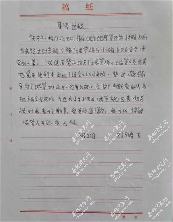 同時(shí),該回復(fù)還出現(xiàn)了學(xué)生和兩名執(zhí)法人員面對(duì)面的照片,在回復(fù)的最后有該學(xué)生手寫的事情過程。據(jù)該學(xué)生手寫過程稱,當(dāng)時(shí)學(xué)生親眼目睹了城管與小販發(fā)生沖突的一幕,既然是親眼目睹,為何會(huì)有視頻中的“隨便打人”一說嗎?可想而知孩子在寫這份事情過程的時(shí)候是什么樣的心情。