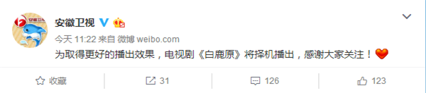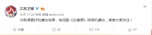 很多守在電視機前準備看《白鹿原》的觀眾都撲空了,江蘇衛(wèi)視和安徽衛(wèi)視原計劃播放第2集的時間卻各自播放了其他內容,但兩方都未對《白鹿原》停播作出解釋。就在今日,兩家衛(wèi)視都官方發(fā)表聲明表示,“為取得更好的播出效果,電視劇《白鹿原》將擇機播出,感謝大家關注!”