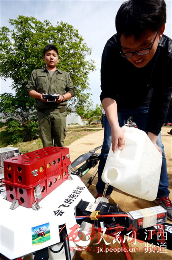 “飛手”正在給無人機(jī)搭載的藥箱內(nèi)灌裝農(nóng)藥