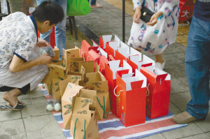 馬鞍東路“粽子江湖”的歷史大致要追溯到上世紀80年代。1980年,居住在馬鞍東路的李太婆,把自己包的粽子拿到院壩門口和附近的曹家巷農貿市場賣,受到她的啟發(fā),“馬婆婆”周啟玉(隨夫姓,下同)拉著“梅婆婆”葉新芳和“任婆婆”張興碧籌劃起了粽子生意。那年開始,端午時節(jié),成都馬鞍東路的“婆婆粽”漸漸名聲在外。如今的馬鞍東路,到端午節(jié)前半個月就熱鬧開來。裁縫鋪、火鍋店、面館……臨街的商鋪都在這個時節(jié)改賣粽子。