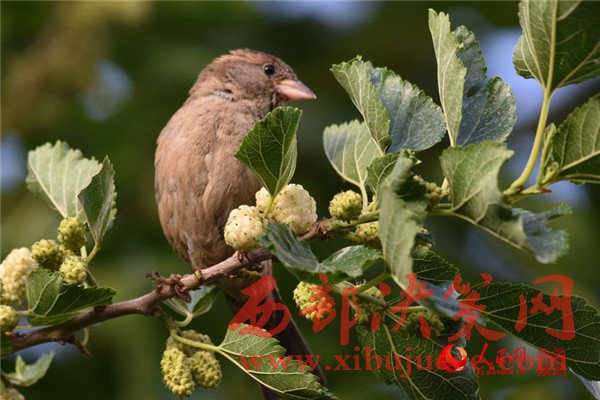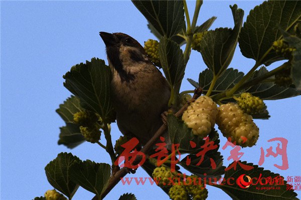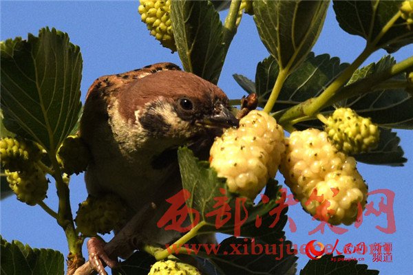 5月25日清晨,在新疆庫(kù)爾勒市一家住宅小區(qū),一只麻雀在吃桑葚。每年的5月底是新疆庫(kù)爾勒地區(qū)白、紅、黑三色桑葚熟透的季節(jié)。目前,三色桑葚已經(jīng)在新疆庫(kù)爾勒市大量上市,吸引市民爭(zhēng)相購(gòu)買(mǎi)品嘗。